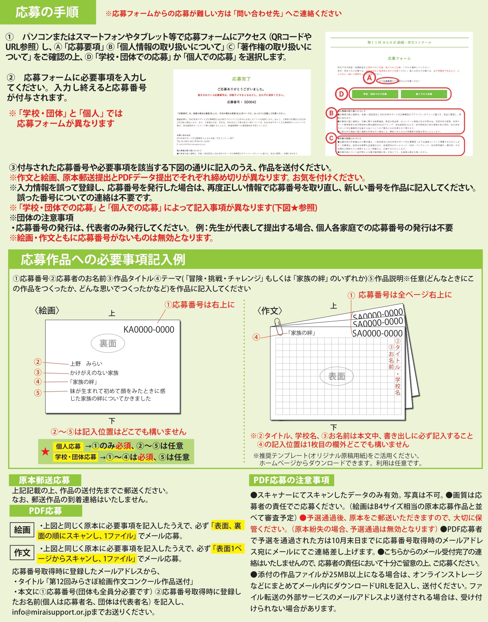 最下部にある応募フォームボタンから、応募フォームに必要項目を入力し送信すると応募番号が付与されます。その応募番号を作品に記入の上、ご応募ください。